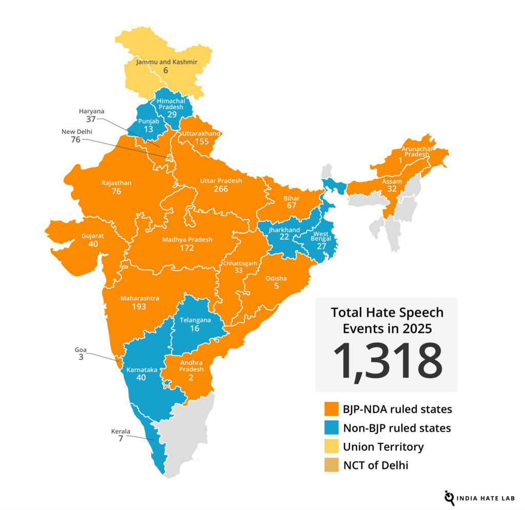 - India Hate Lab (IHL) documented 1,318 hate speech events targeting religious minorities, particularly Muslims and Christians, in 2025 across 21 states, one union territory, and the National Capital Territory (NCT) of Delhi. On average, four hate speech events occurred per day. This marks a 13% increase from 2024, and 97% increase from 2023, when 668 such incidents were recorded.