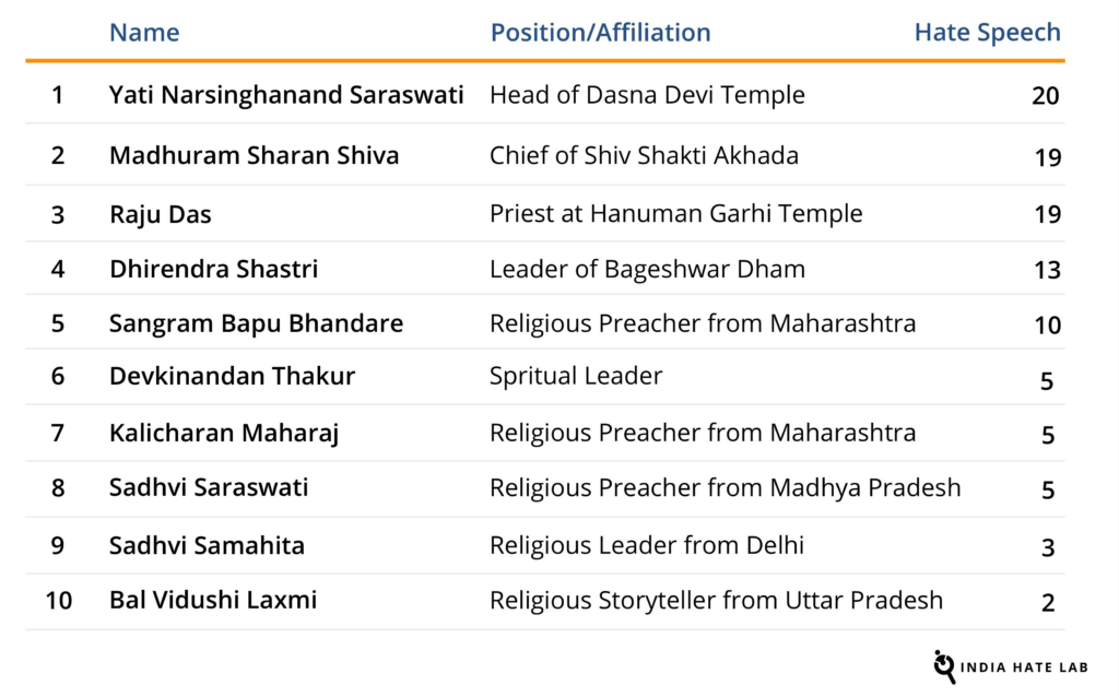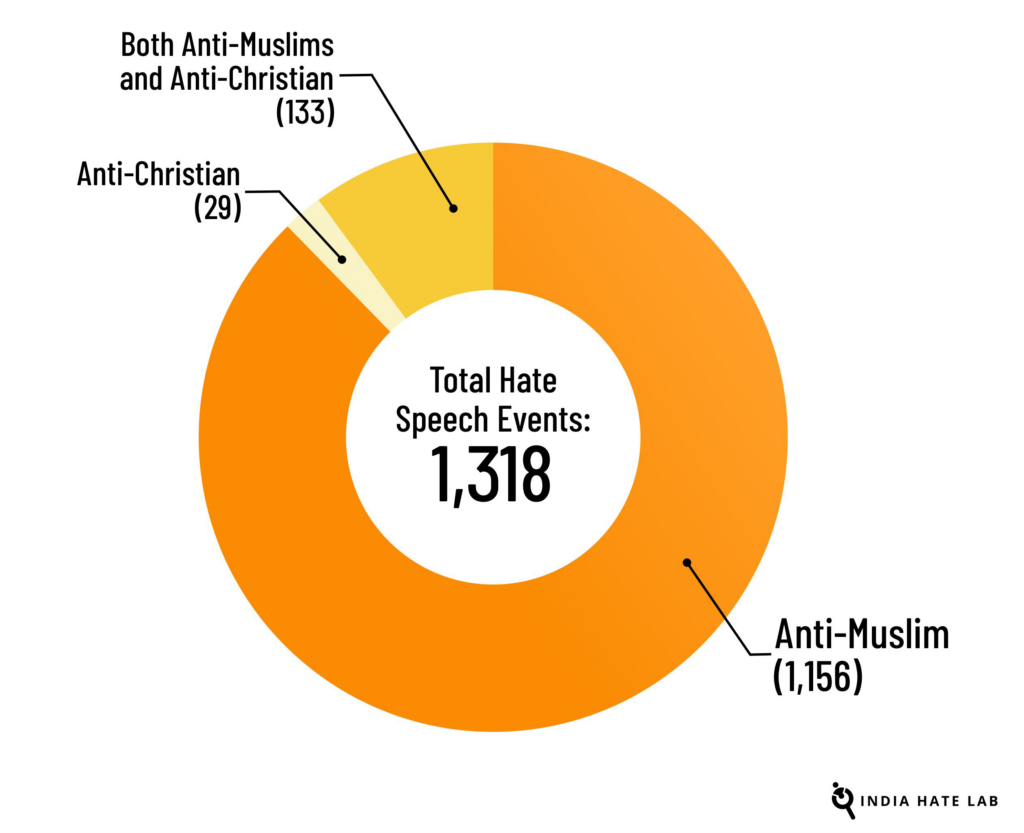 - 656 hate speeches (nearly 50 percent) referenced conspiracy theories, including “love jihad,” “land jihad,” “population jihad,” “thook (spit) jihad,” “education jihad,” “drug jihad,” and “vote jihad,” representing a 13 percent increase from the previous year.