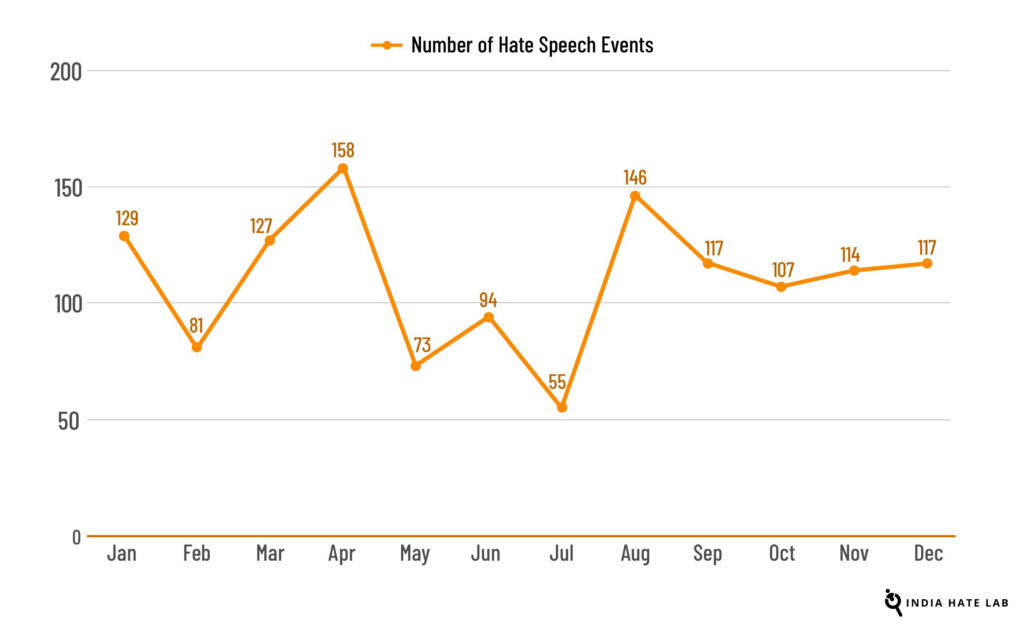 - April recorded the highest monthly spike, with 158 hate speech events coinciding with Ram Navami processions and hate rallies organized in response to the Pahalgam terror attack.
