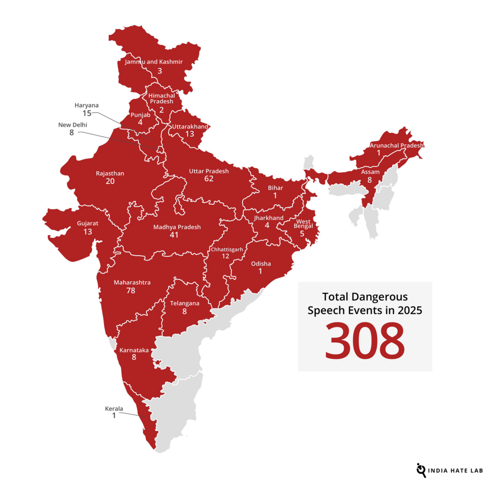 - Maharashtra recorded the highest number of dangerous speeches, with 78 incidents, up from 64 in 2024. Nearly 40 percent of the state’s 193 hate speech events involved explicit calls for violence, the highest proportion recorded for any state.