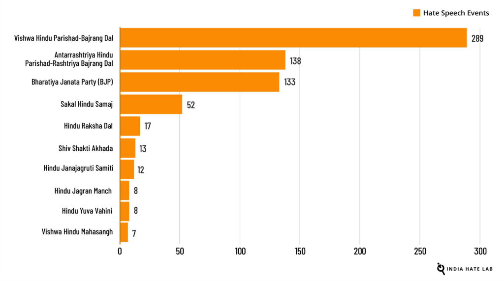 The ecosystem of hate maintained its highly organized character in 2025. As in the preceding year, the Bharatiya Janata Party (BJP) and Rashtriya Swayamsevak Sangh (RSS) affiliates such as the Vishwa Hindu Parishad (VHP) and the Bajrang Dal were central drivers of in-person hate speech events. Complementing these organizations, other far-right groups, including the Antarrashtriya Hindu Parishad, Rashtriya Bajrang Dal, Sakal Hindu Samaj, and the Hindu Janajagruti Samiti (HJS), also played a significant role as architects and facilitators of hate-speech mobilization.
