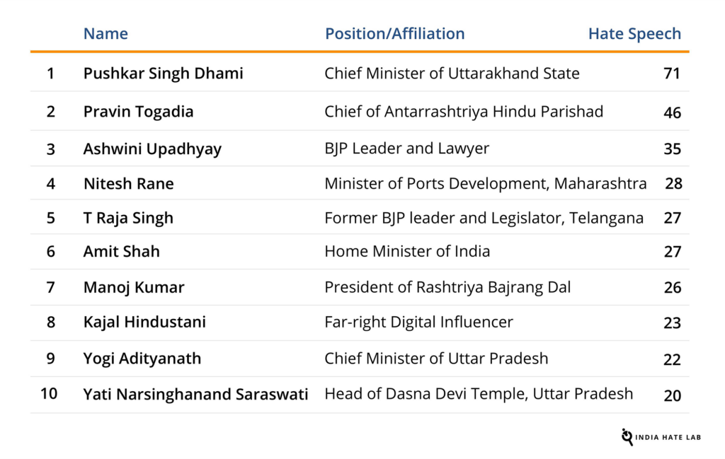- Uttarakhand Chief Minister Pushkar Singh Dhami emerged as the most prolific hate-speech actor in 2025, with 71 speeches, followed by Antarrashtriya Hindu Parishad chief Pravin Togadia (46) and BJP leader Ashwini Upadhyay (35).